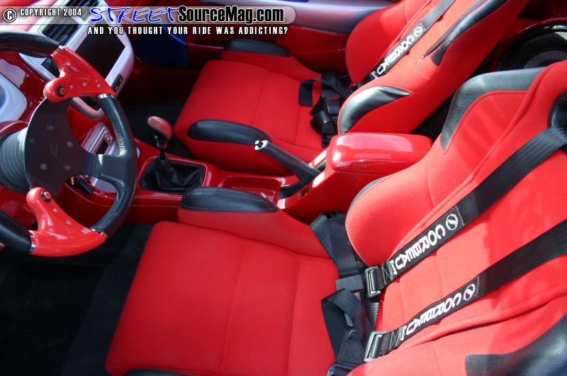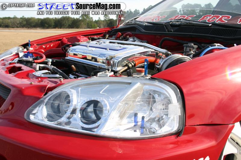 Through the clear hood you can view the B16 motor swapped in by DBI Performance. An AEM intake insures that Gary’s Civic always gets cool clean air while a Chrome valve cover, strut tower brace, and color matched rubber lines keep the engine bay looking clean.