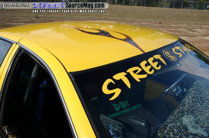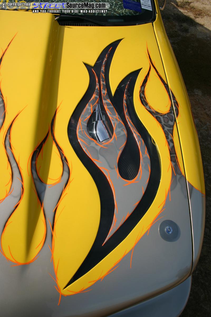 With all of the bodywork complete and the fabrication over it was now time for Jason and Gary Young at Street Styles to lay down some paint. Gold flames start off in the front which fade into Giraffe print graphics, these are followed by Dupont yellow which flows into the doors and quarters and has a flame graphic at the end, the color then goes into a dark blue which was accented with ghosted skull graphics. The car was then cleared and buffed to perfection.