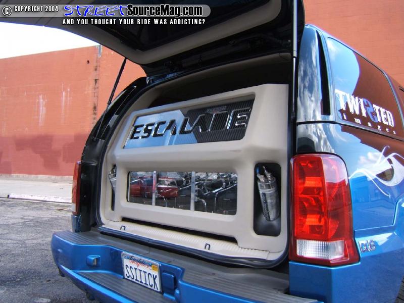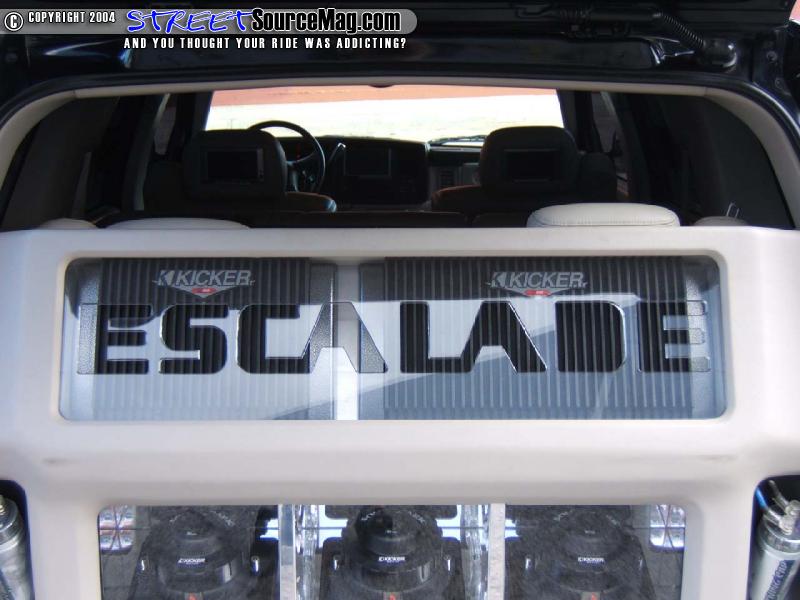 Then the guys at Paradyme mounted 3 10inch Kicker Solo Baric subwoofers in a custom made box behind the third row seats and the rear hatch. The Kicker amplifiers are mounted above the subwoofers with custom blue neon and plexi-glass cut cover with the word “ESCALADE” etched into it. Then custom made kick panels were made to house the upgraded components speakers.