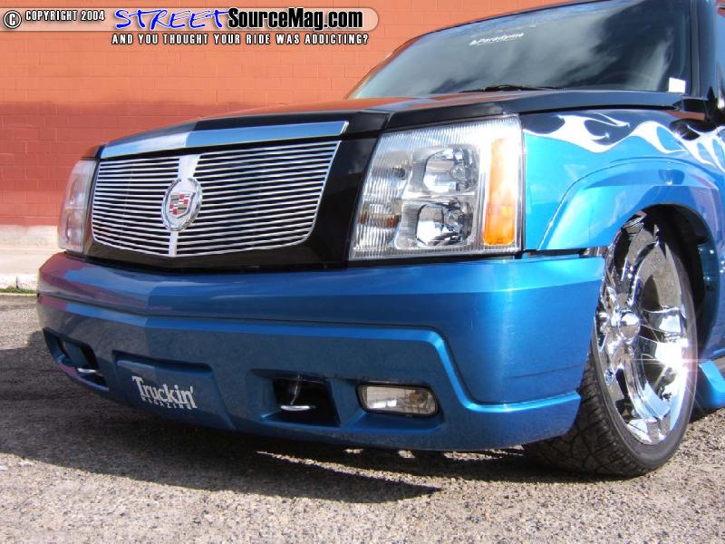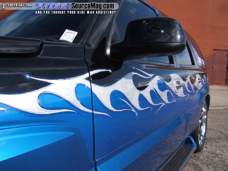 James, first two toned the truck by adding Blue to the top half and then used a silver flame to break up the two tone and add a little flair. But masking and laying down paint is not what Cashman is known for, it’s his airbrushing and he sure did a number adding Caddy logos all over Mike’s ride. It only took James 7 weeks to work his magic, and then the Escalade was loaded on the only trailer it has been on for a show and taken to Vegas for the SEMA show.