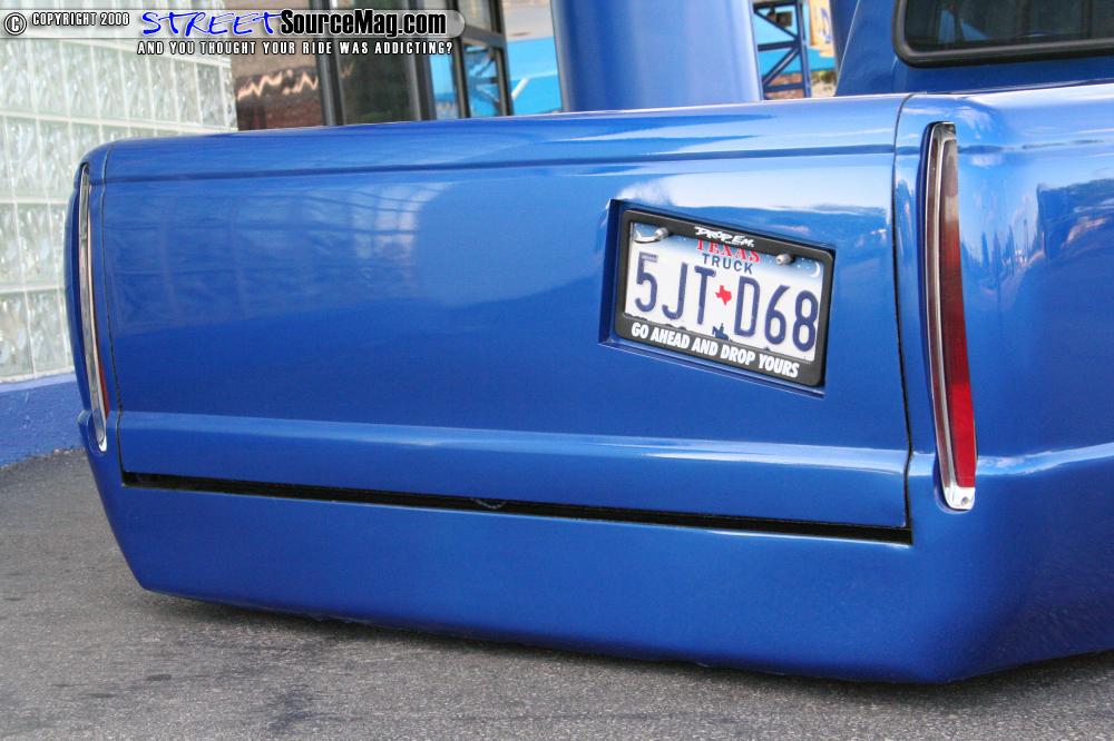 When the truck remerged it was heavily coated in the fine Sherwin Williams brand Electric Blue pearl. Underneath the attention grabbing paint you will not find Door handles, a tailgate handle, a gas filler door, stake pockets, and you will definitely not see an antenna. Also gone are the factory taillights, making a new home in their void are Cadillac tails with chrome bezels. Rear bumpers have no use when you do not tow a boat so a rollpan was thrown in to finish it off.