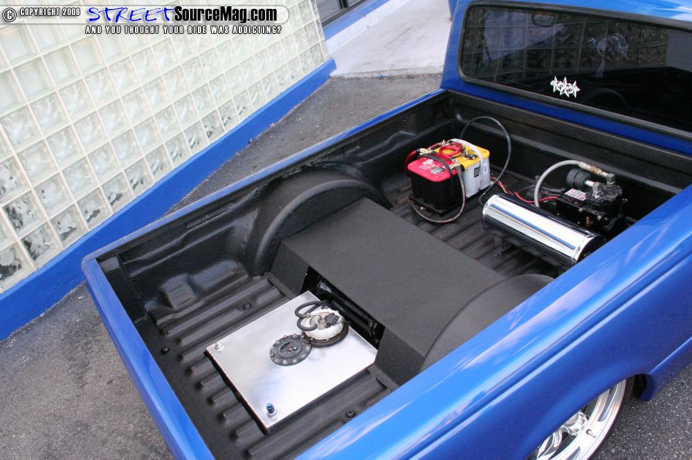 Without the aired out suspension this truck would not be able to cuddle with the 17x7 Centerline Daggers wrapped in 215 40 17 Kumho Fires. In the front the bags made their resting place on the radius arms. In the back they rest on a cantilever 6 link all being fed by ½ inch lines and valves.