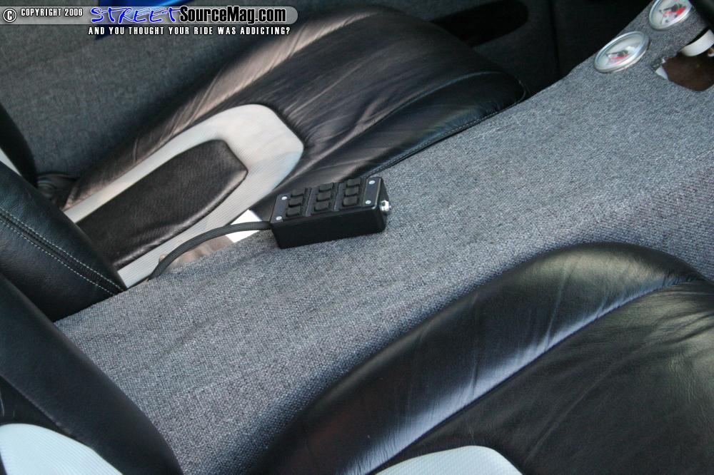 Blinding the driver on those sunny afternoons is executed by the Billet Specialties steering wheel, billet rear view mirror and billet shifter knob. The factory seats were chopped to a smaller size and covered with black leather and silver ostrich hides. A custom console was made to house the air gauges with a space for the shifter to peak through and was covered in grey tweed. Keeping the factory style carpet was not a hard task with the stock floor bodydrop and center console covering the center that was modified to fit over the transmission and driveshaft tunnels.