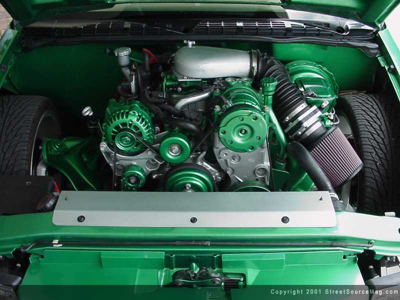 Next, the firewall was smoothed and painted. The factory 4.3 was cleaned and painted green and silver. In addition, Taylor plug wires, Edelbrock headers and a K&N filter was added. To bring it all together, a Flexalite dual 12 inch electric fan was added. To get the deep throat sound, Matt decided to go with a 3” Dynomax muffler and the exhaust was applied with a Ceramic finish. The engine wiring harness was also modified to clean up the engine.