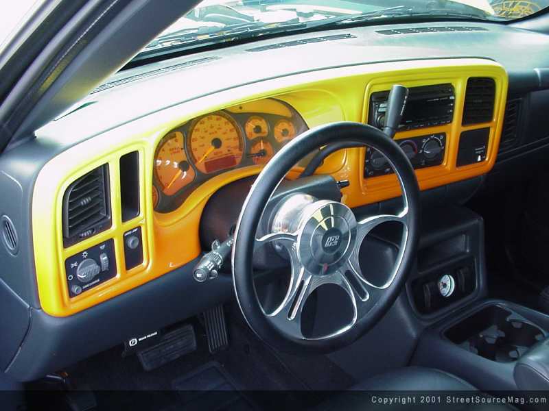 The interior of Pat’s truck had to be a comfort zone. You see, this truck is a daily driven tow vehicle. Pat decided to custom paint his dash and add a set of APC gauges with yellow tint to match. The Katskin leather seats and factory interior were complimented with a Naiser Racing Compenents steering wheel. For listening pleasures, and Alpine CDA 855 head unit was installed. Using JL Audio 12” sub and MB Quarts mids and tweets, the whole system is powered by a six channel Rockford Fosgate amp. The stereo was installed by Home Entertainment.