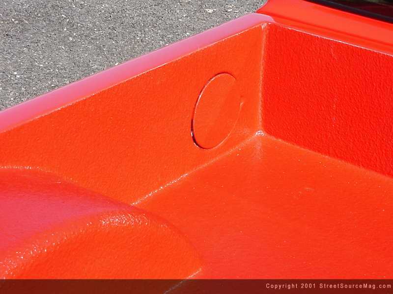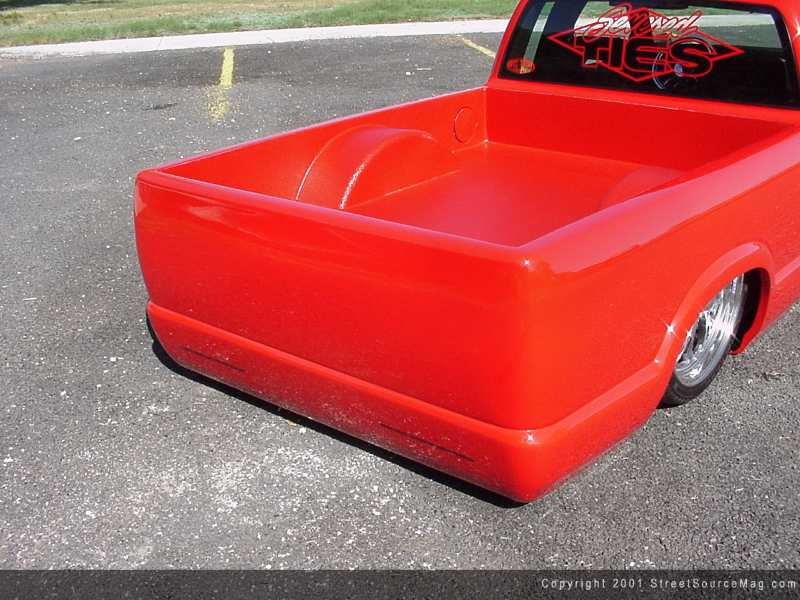 Now with the S-10 laying body evenly on the pavement, it was a must to start working the exterior to complement the low stance. Performing the exterior modifications that would help this mini stand out would be Pats Auto of Houston, Texas. While there many modifications to the body would be worked and smoothed. Starting in the rear, a custom roll pan would be molded to the bed. Keeping with the smooth look, the taillights would be ditched and LED's would take their place into the newfound roll pan. After the tailgate being welded shut completing the ass end, it was time to head to the front. On the way forward, the bodylines would all be smoothed out and the gas filler door would be shaved and relocated into the bed.