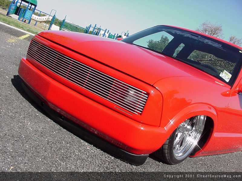 With the cab touched up, the front clip was all that awaited the customizing skills of Pats Auto. The front is where the unique modifications reside. With the custom grille with billet inserts bolted up, the front blinkers would be cut and molded into the grille shell itself with LEDs. Next the crew at Pats Auto molded the shortened 94 full-size Chevy front bumper to the fenders.