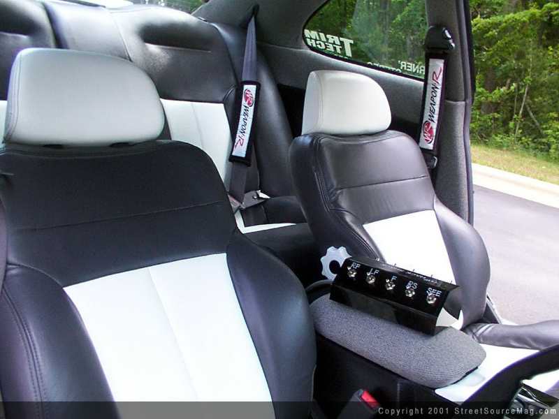 Once you've taken in the entire exterior, your eyes move to the full out custom interior. All three seats have been wrapped in gray leather with white inserts. The rest of the interior you'll find several yards of gray and black tweed in the company of tribal graphics in everything from the dash to the rear deck lid.