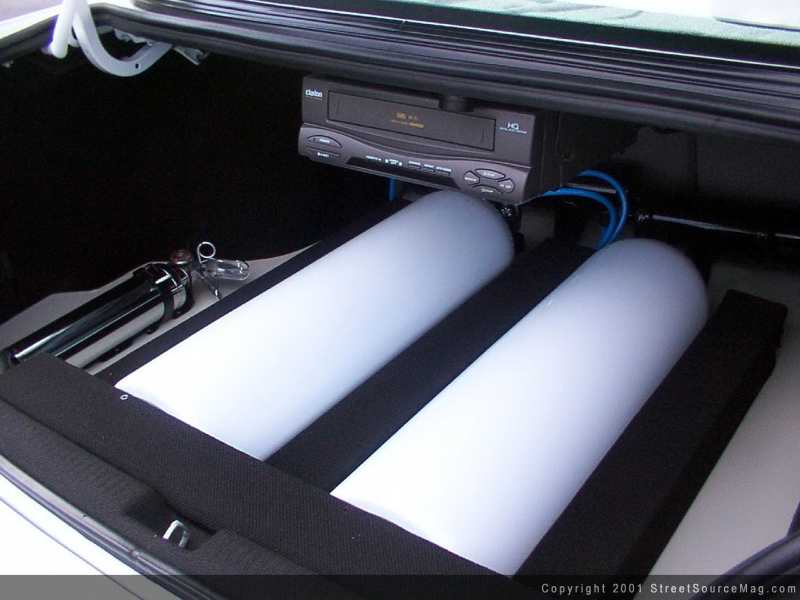 Making sure the Sebring would have a round-hugging stance, Scott decided to use a full air cylinder set up. This was done by using 6" cylinders from Blow Jax on all four corners. The entire air system is controlled by a 10-switch box with the addition of 2 reverse valves used to "suck" the rear wheels into the fender wells for a standing dogleg.
