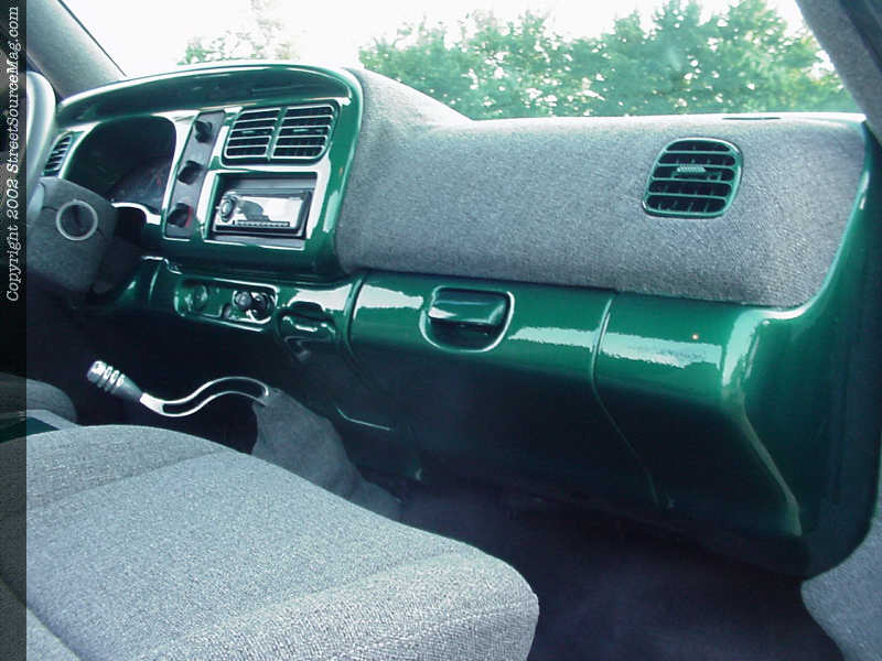 Knowing that he couldn't compete in the show scene with out interior Ryan went to town on the inside of his Dakota. Starting with the Dash, Ryan decided to smooth it out, paint it along with tweeding the door panels. The headliner would then be tweeded to match along with other tweed and painted panels.