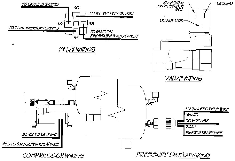 7. Refer to wiring diagram for the final wiring of the Parker valves, relay and compressors.200 PSI pressure switch wiring:Relay 30- To 12 volt power (to battery) 85- Ground to Chassis 86- Blue on PSI switch 87- Red on compressorPressure Switch Blue to 86 on relay Red (DO NOT USE) Purple to ignition 12 volt powerCompressor Red to 87 on relay Black to Chassis groundWiringF.B.S.S AssemblyValve Assembly