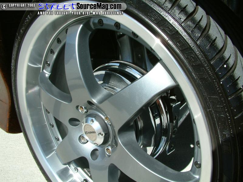 Finishing this true custom off, Kenny would need the suspension reworked. For starters Kenny would have a set of polished SMC cylinders installed at each corner along with ½ inch SMC valves for quick movement. Behind the 18-inch Tenzo R Mean 6 rims wrapped in an aggressive 215/35 Nankang tire, you can also see the detail of Chrome drums, Brembo Power Stop crossed drilled rotors along with an APR chromed sway bars.