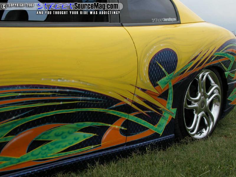 After starting there, Silvey continued to make mods throughout the interior. Again with help of friends and Pat Read, Chris rolled the graphics of the exterior into the custom door panels and dash. He also added the custom air gauges into the pillar of the Sunfire for an even more dramatic effect.