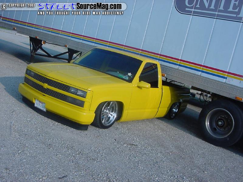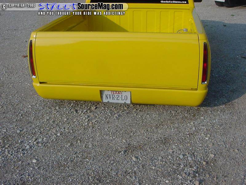 Before the competition yellow was laid down Brian welded up the door handles and antennae hole and ditched the factory taillights in exchange for a set of 98' caddy lights. To add to the exterior Kyle also ditched the factory "elephant ear" mirrors for a set of Street Scene mirrors and added a full phantom billet grill up front.