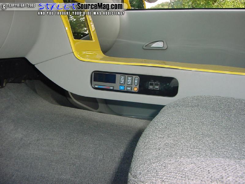 Now to my favorite part of this truck that always makes me stop and drool, the interior. Kyle relied in Chuck's car stereo to build him this awesome one off dash that holds a 7" eclipse monitor and flows nicely down into a console . Instead of using factory gauges Kyle picked out some Dolphin white face to add a luxury look.