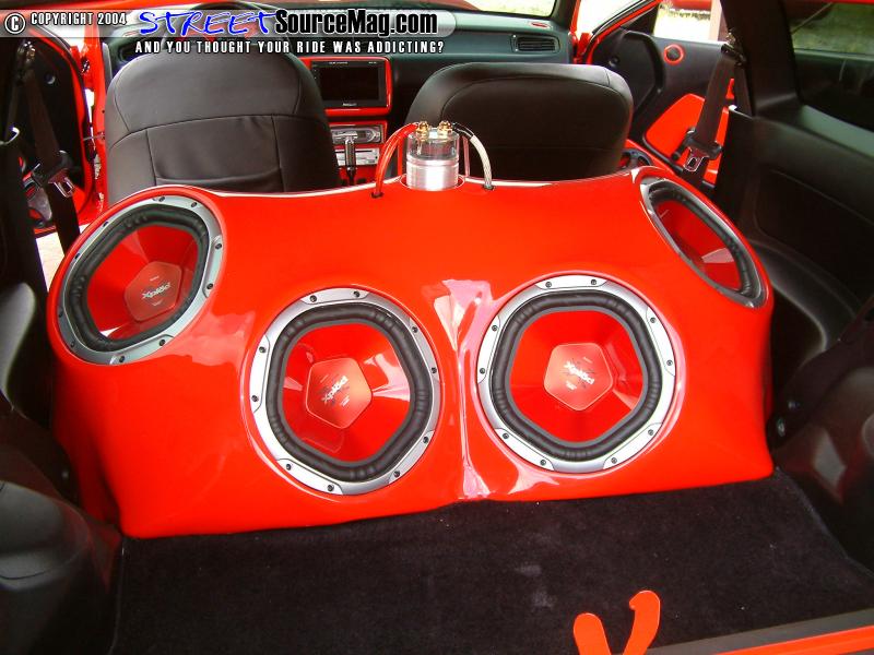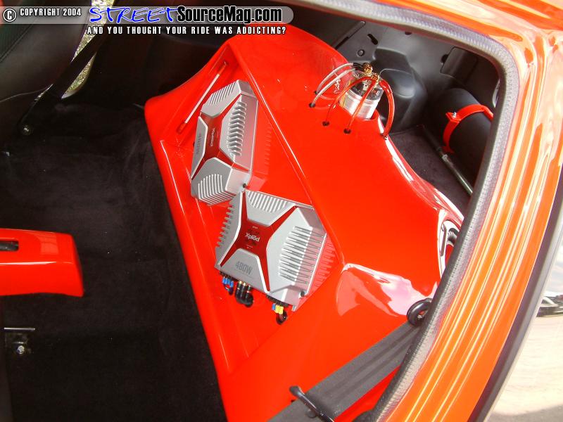 Not yet finished in the cabin, Jennifer would now rely on Wayne to wire up the video and audio. The tunes would start with a Sony X-plod CD player mounted into the custom-built center console. Sony X-plod 6.5 and Planet Audio TS-30’s where then installed into custom built locations for the highs and mids, while 4 Sony X-plod 10’s are ran for the much desired bass.  (2) 480 Sony X-plod amplifiers would be installed into the mix to power the new speakers to ungodly volume and accompanied along with the subs in the newly custom fiberglass box. With the audio taken care of it was time for video. To accomplish this Jennifer would have a 7.5” LCD installed along with a new DVD Player.