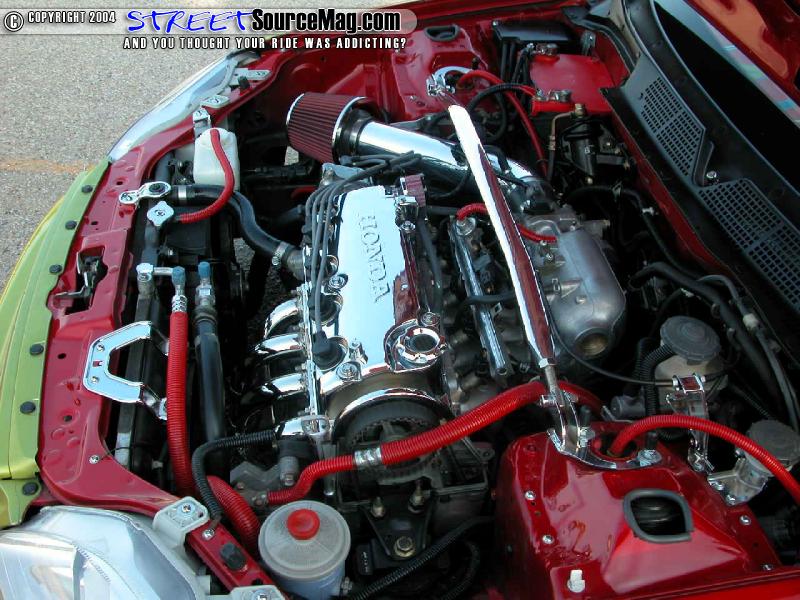 Finally, Steven turned his attention to the engine bay. Here he chromed the A/C condenser brackets, the hood hinges, the power steering mount, and the master brake cylinder. He used all polished stainless steel nuts and bolts throughout the engine bay, upgraded to a chrome air intake and filter, rerouted most of the wiring for a cleaner look, and added a chrome strut bar for stability. He also worked in a DC Sports header, which leads to a chrome down pipe and an APEXI muffler.