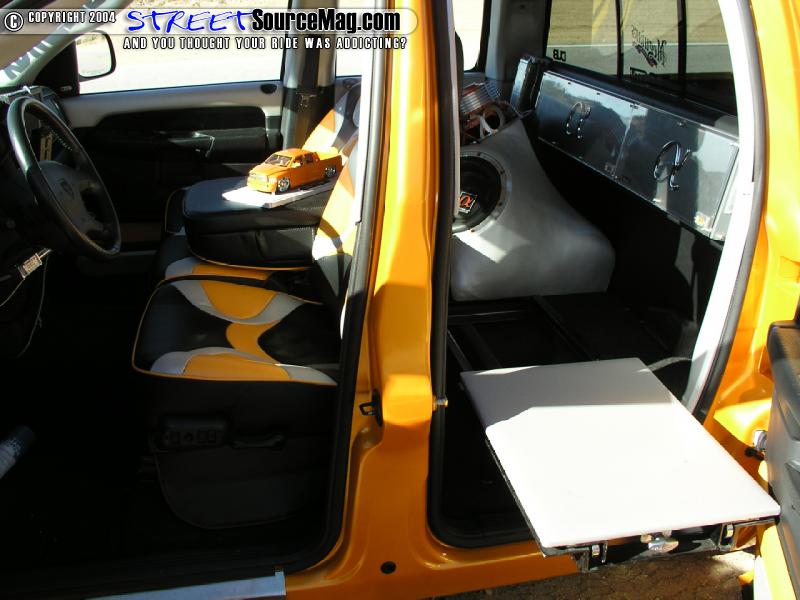 Moving back the antenna, door handles, tailgate handle and stake pockets would all be shaved. The rear bumper would then be ditched and a Sir Michaels roll pan installed in its place.   The rear driver door would then be suicided by Devious Customs. A CR Laurence rear power slide window would then be installed along with a Rag top by American Sunroofs Inalfa for ultimate in sunshine enjoyment.