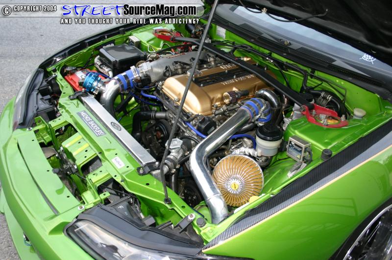 Under the hood sits a factory of pure HP. The SR20DET motor features a Magnaflow Titanium cat back exhaust, Veilside turbo manifold, Greddy Intake Manifold, Greddy down pipe, Tail blow off valve, Ractive Vacuum hoses, Nitrous Express direct port 100 shot, Nitrous Express intercooler kit, Silvia radiator with cooling fan, and competition clutch and flywheel.