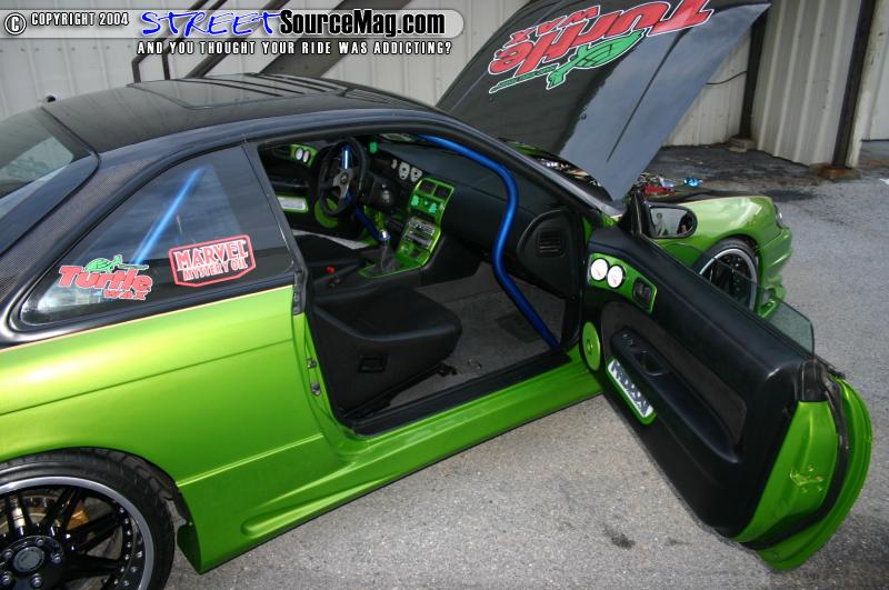 Upon opening the doors a Cusco 6-point roll cage greats you along with the Momo Steering wheel equipped with Tekniq Autosports snap-off system and Momo hub adapter. The interior also houses Nismo S15 floor mats, Sparco racing seats with harnesses, Stewart Warner gauges, Veilside titanium shift knob, Veilside titanium pedals, a custom center console, and a mad carbon shifter boot.