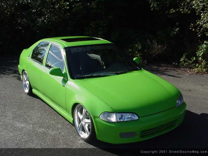 After liking the looks of the smooth hood it was time to apply the same to the under-side of the trunk lid. After shaving the sides, front and back of the Civic, it was time to remove the body seams and add a power sunroof.   Next on the agenda would be to bolt up a Wings West body-kit mixed with a Grill Craft grill and a set of projector headlights along with a stock 2-door coupe front bumper to give the front end a new over all look. Once the bodywork was complete, it was time to lay down the PPG Kawasaki green paint. Friends Tom Jacobs and Jason Haase performed the bodywork, while Matt Brown applied the paint.