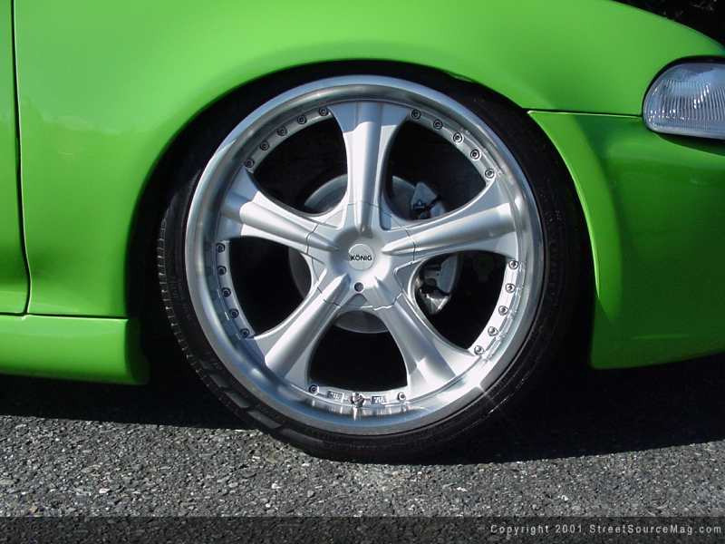 | Sporting 18x7 Konig Caffine’s wrapped in 215/35/18 Nitto 450’s. | To finish off any best of show vehilce, it was time to get the engine up to par with the rest of the car. To manage this, Jason had many parts chromed out and painted. Along with those items, he installed a RS Akimoto intake with 2 ½” cat back exhaust to allow the engine to breath.  To get appropriate fuel mixed in with the air, Jason purchased a Stillen fuel pressure riser along with Magnecore plug wires to provide the spark.