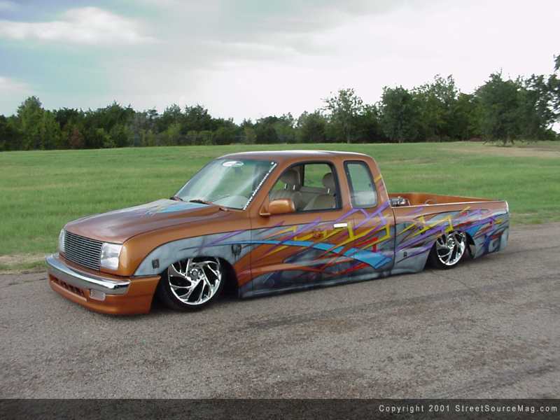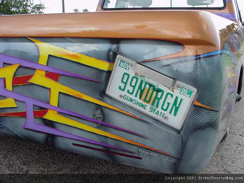The tailgate was then welded shut, the taillights shaved and replaced with Hagan rod wear tail lights. Next a Sir Micheals roll pan was welded in and the license plate box was molded at an angle in the stock taillight location. At this point the truck was nearly complete on the outside. A PPG Saphron Gold paint was added to finish the outer looks.
