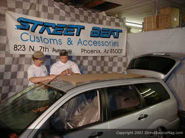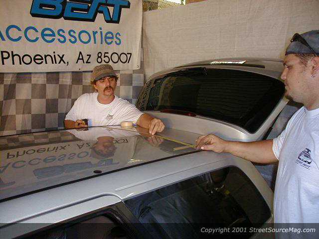 Step 5: After pulling the headliner (which I had already done prior to bringing it to Street Beat) cut the roof supports out with a die grinder. Step 6: Using the provided template, mark out the spot where the slider is going. Step 7: Using a ruler and masking tape, find the center and make sure everything is straight and centered.
