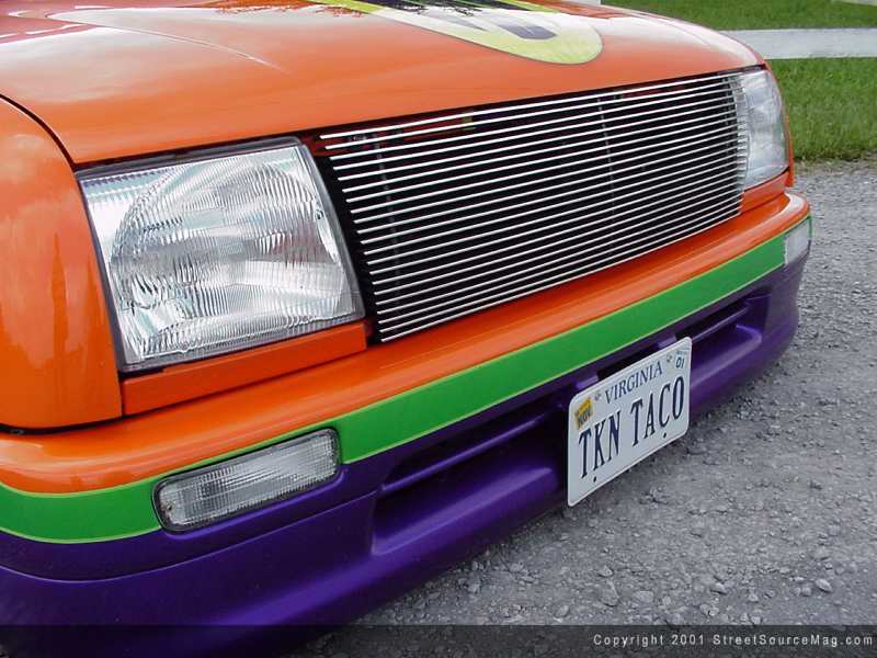 In the midst of the current stance being a gratifying one, the body would be next on the hit list. Beginning from the front and moving to the rear, the hood was left alone with Todd and the crew performing an engine drop. A Trenz grille was installed for the phantom look, while a set of 4x4 fenders with shaved corner lamps where mounted to give the Taco a wider stance. Above the stock bumper and snug against the Trenz grille you will find a set of 2000 Tacoma headlights. Moving towards the rear of the Taco would mean not missing a panel along the way. With the antenna shaved, the door handles would also need to go. Other stock items needing placed in the trash would be the mirrors, which were replaced with a much sportier set. Atop the cab you will find a Street Beat ragtop to allow the Virginia sun through on the warm summer days.