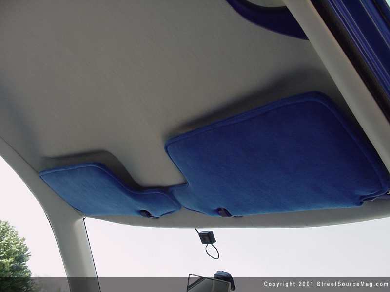 Keeping the front of the cab at a top custom level, the steering wheel was replaced with one from MOMO along with the install of a billet rearview mirror.  The gauges would then be removed in favor for a set of white face gauges and all of the vents where then dyed blue. Accompanying the new racing seats would be a set of Tenzo-R racing harnesses. But the custom interior wouldn't stop there; the rear deck would be removed of the 3rd brake along with the speaker pods and wrapped.