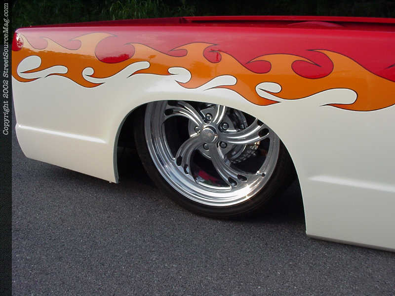 To start, a combination of PPG Viper Red and PPG Vanilla Shake two-tone base set the stage for the PPG Fleet Orange tribal flames, which were applied by Denny. To add further appeal, Denny utilized black and added color seperating pinstripes.