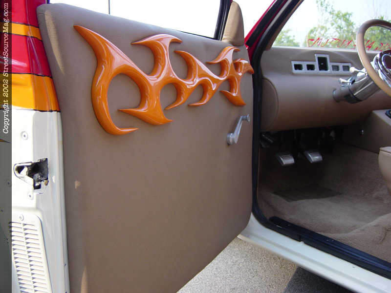 Inside the cab, Les turned to Tracy Swanner and Alan Lightsey for their help flowing the outside paint scheme into the cab. The job was handled with perfection. First, you will find a custom built dash, complete with Dakota digital gauges. Next, the door panels were restitched using walnut leather. The panels even include matching orange flames.  The factory seats where trashed and replaced with '91 Toyota Camry seats, rewrapped in walnut leather as well.