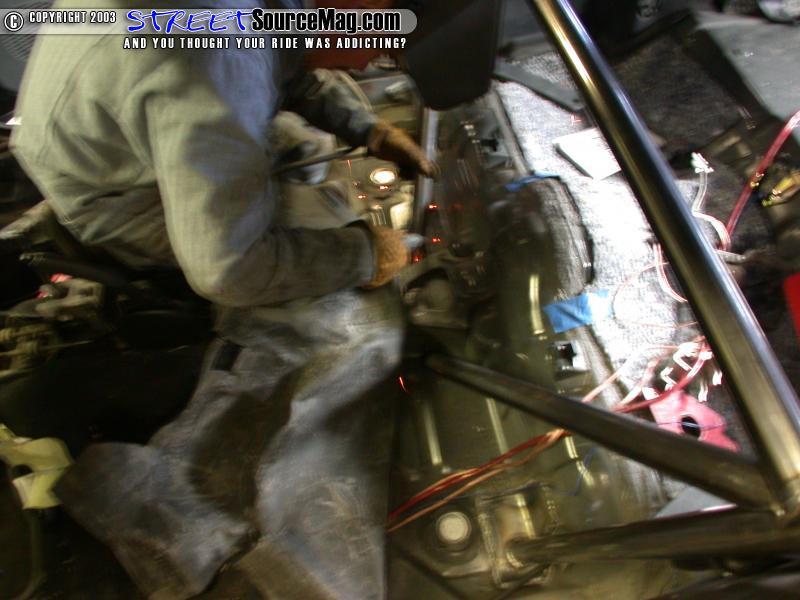 Now we need to test fit the rear braces. We choose to have the rear braces go through the rear deck and mount to the rear of the trunk (for a more rigid body). To do this we had to drill holes in the rear deck gussets for the bars to go thru. We installed plates in the trunk (like the ones before) for the rear braces to attach to. Then we tack welded the rear braces in place.