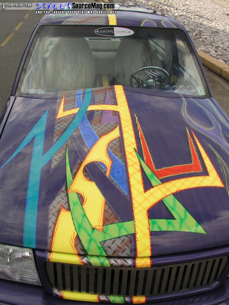With all the body mods complete William went back over the truck priming and blocking it until every imperfection was removed and the shiny stuff could be applied. House of Colors purple was then spayed onto the smoothed firewall, the underside of the cab and the entire body of the lil Blazer. This is were the majority of people would have quite and called it done but there was no way that was going to happen so William added a combination of diamond plate, cheddar cheese, flames, slash and alien skin graphics in a variety of hues from HOK that flowed from the body on thru the door jams.