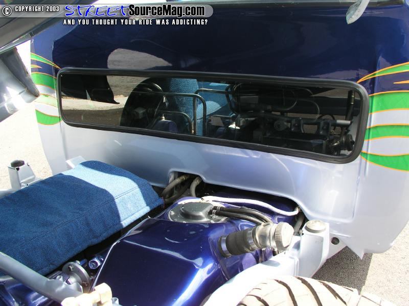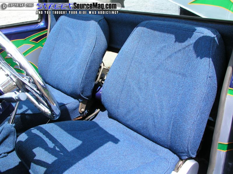Wanting the graphics scheme to flow into the interior Chad's Dad cut custom metal door panels and then treated them to the same matching graphics designs that adorn the exterior. Once the dash and door panels were in place a Colorado Customs Wild Horse billet steering wheel was installed. The factory bench seat was replaced with donors from a Pathfinder but only without the headrest. Juan's Upholstery in Pearl, MS then covered the seats and floor with Sherpia Blue tweed.