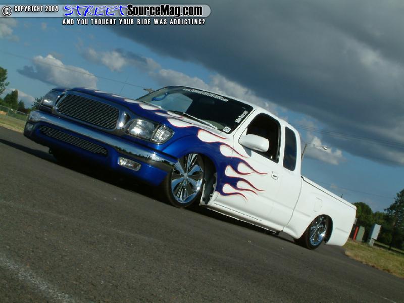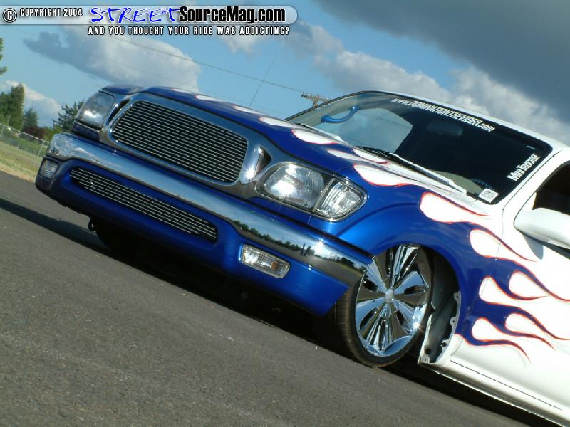 To finish up the bling Oliver would install a billet antenna along with a Snug Top tonnaeu cover. Scott at Drew Bros. Customs of chandler, AZ would be responsible for the body modifications. Once the bodywork was straight and the base white was re sprayed Oliver would have a set of Corvette blue flames pinstriped in orange.