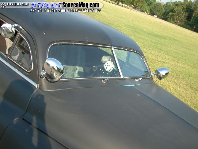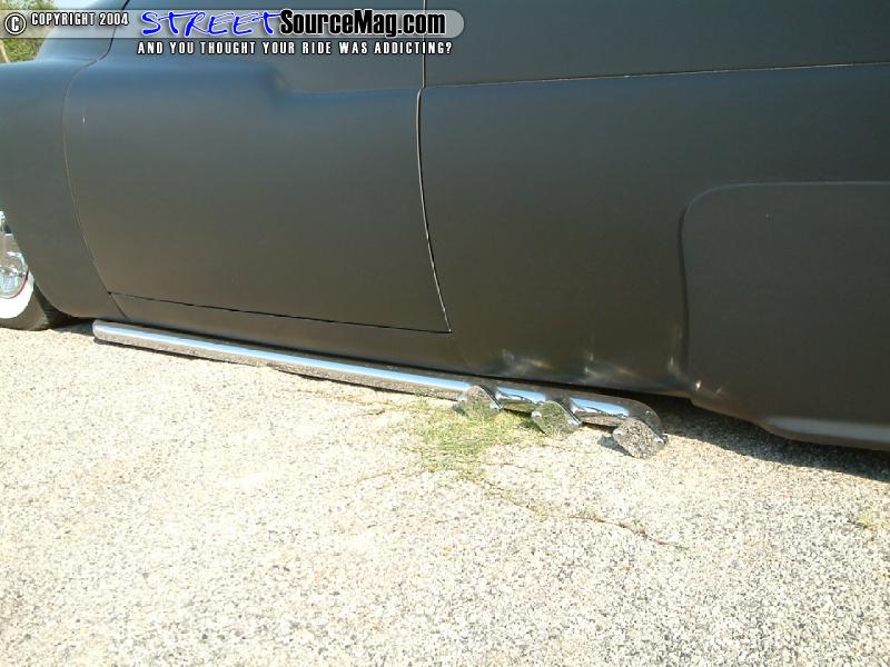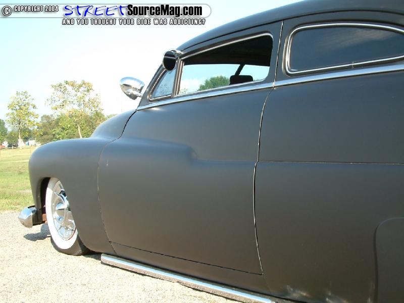 Getting the exterior mods-rolling Scooter would tear down the Merc and begin cutting the roof. With the pillars cut and the roof sectioned to the correct proportion he would end up with a 4-½ inch chop top. Next Scooter would cut into the side skirts extending them 2 inches.