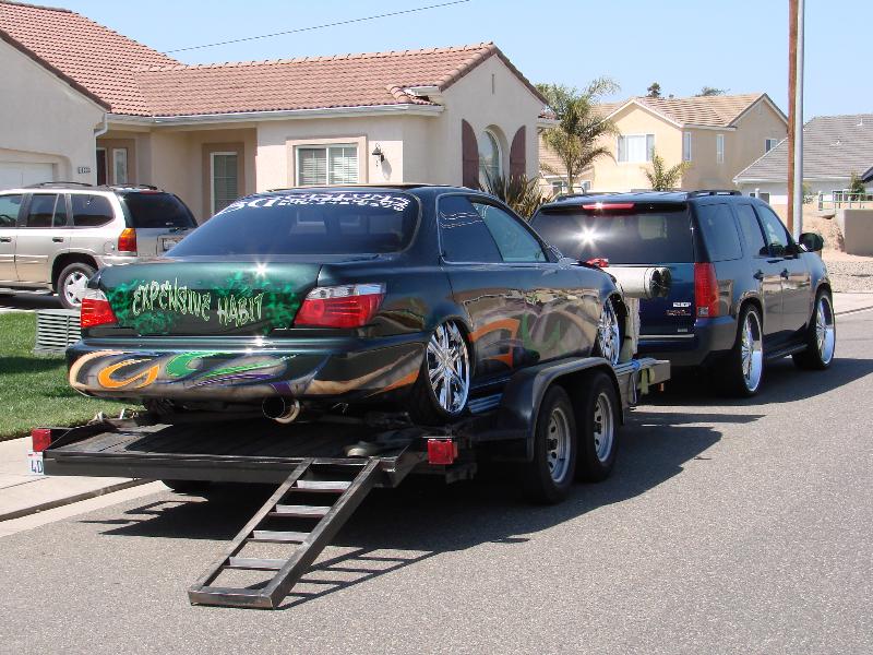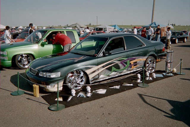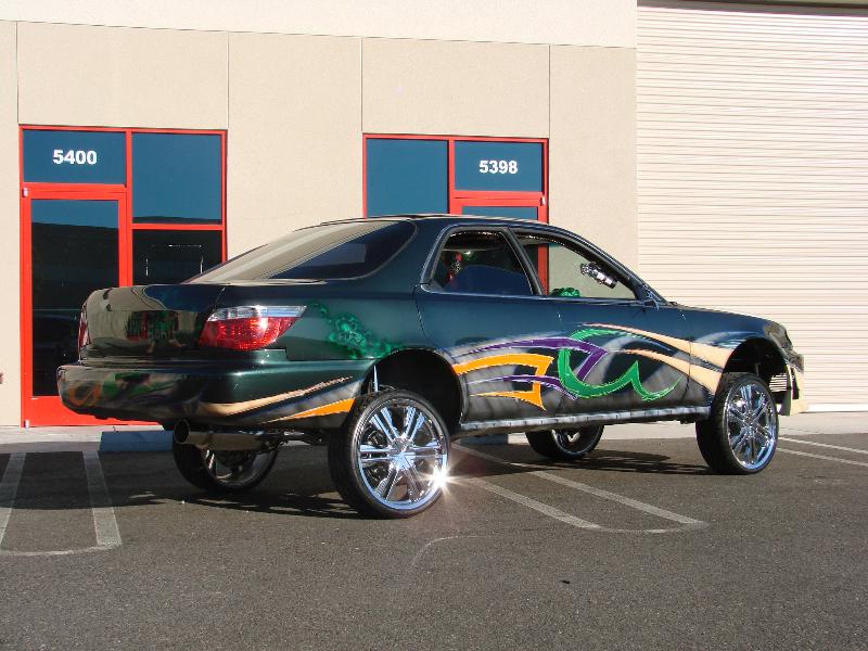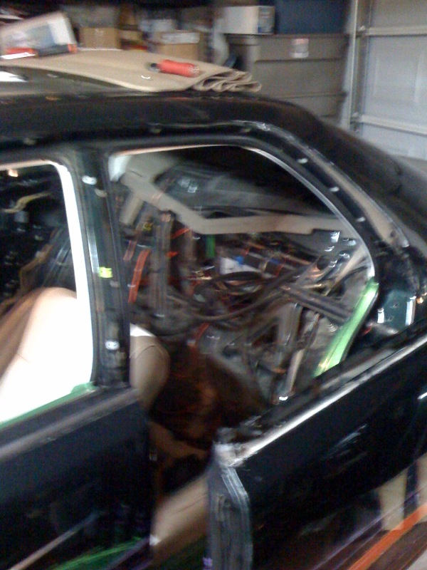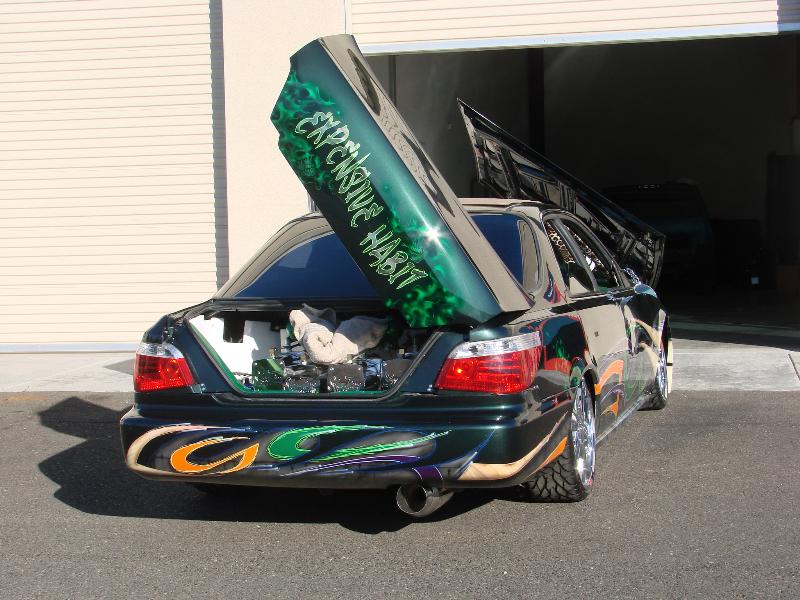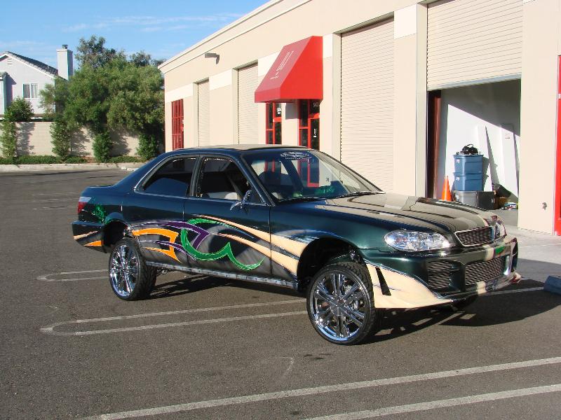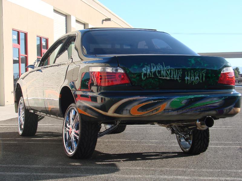 front end infiniti i30 headlight swap, bmw 5 series back end swap, motorized suicide hood and trunk, lambo front doors, and suicide lambo rear doors, shaved handles and moldings, custom made front bumper, custom cut billet grills. 35x40 street beat ragtop. redoing some shit.