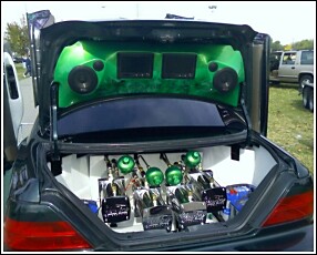 42 inch plasma in back seat, where back seat used to be, 3 12 inch eclipse chrome subwoofers, 2 arc audio amps. 2 tvs in visors, 2 tvs in trunk, fiberglassesd with mids and tweets, all done by me. 9 tvs total in car. taking out all tvs, there a waste dont watch them in the car anyways, just there for show. time to use them at the house.