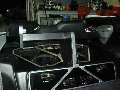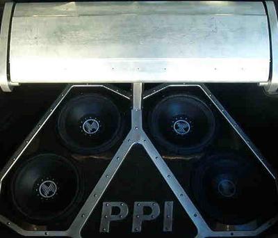 Custom Water-Jet cut billet aluminum and welded steel amp-rack. Custom PPI PCX-5800 in a PCX2400 Heatsink. Four PPI C series 10" subs. 2 PPI 3-way 6/4/1" component sets. Kenwood Double-Din Headunit.