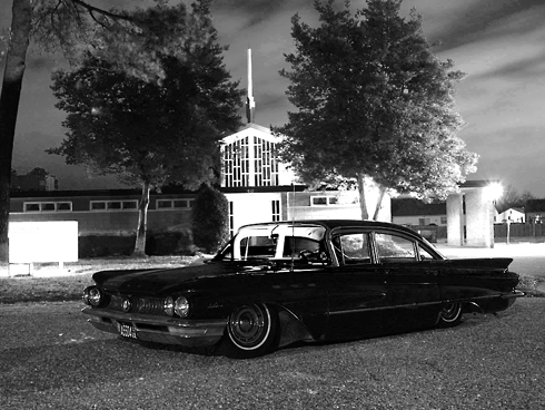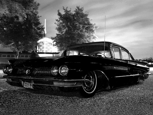 body work,mild de-chroming,flat black with a shiny roof of some color,heavy flake on the roof,wider whitewalls