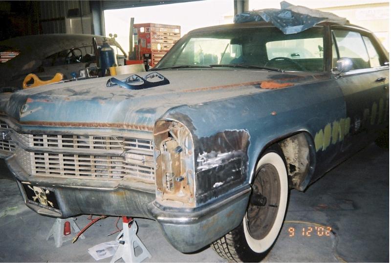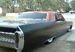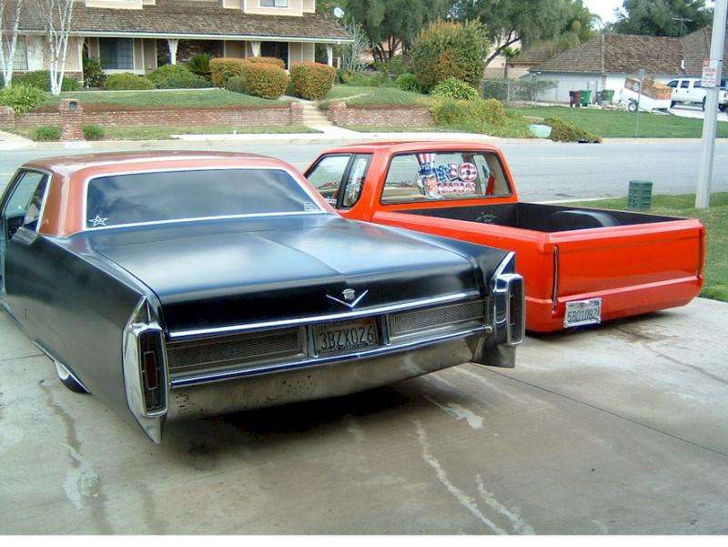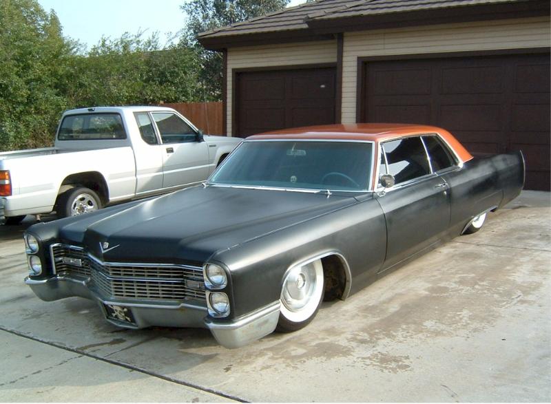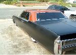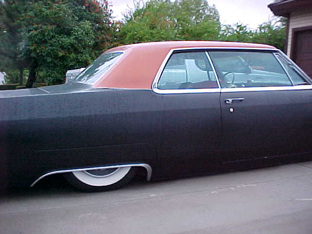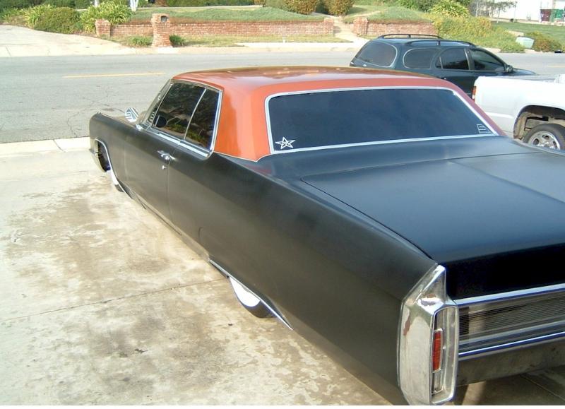 satin black using 99k shot by max at bio kustumz and me...well i just stood there and watched but i helped sand the big thing. the roof is painted some type of dodge orange wich had a lot of metallic then we shot some orange glitter over that and two coats of clear. REALLY SPARKLY. shaved corners, side chrome, antenna. It also sports the back of a sixty five caddy including the trunk, bumper and tailights..(NOT A BOLT ON) Bio Kustumz really had to do some modifying for it too fit.