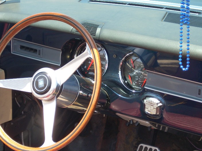 rough, custom dash w/ 5"Autometer gauges, GTO bucket seats, 66 Ferrari wood steering wheel, push button shifter