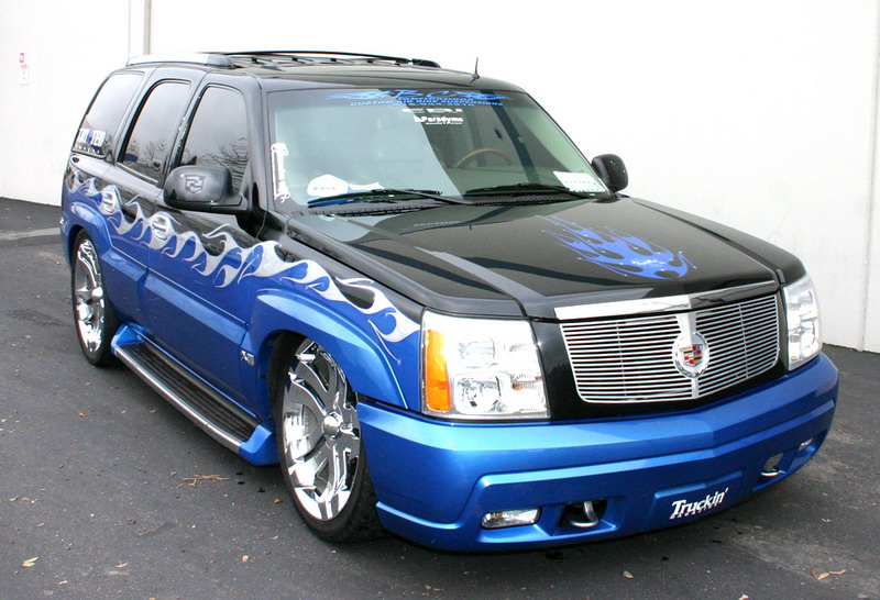 House of colors true blue w/ turquoise flake on bottom half with "escalade" ghosted on front door, silver tribal flames with cadi shields air brushed in. cadi shields on side mirrors, and tribal flame shield on top side of hood. Tribal flames in window tint and Cadi shield (that matches my tattoo) in rear window. Chrome tow hooks, Trenz billet grill, 2-Street Glow under car kits (blue), Crystal Eyes euro tail lights(painted over of course) "How could you put EURO lights on a CADI???" DUB 24" chrome badges just added.