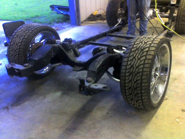 big dominator bags up front, slam re7s out back. impala ss rear end. four linked, gc extreme valves all half inch. FBI control arms shortend 3/4 of an inch for clearance. Full frame built from firewall backm stock floor to the rockers.