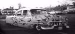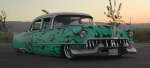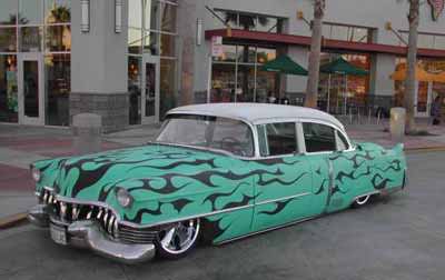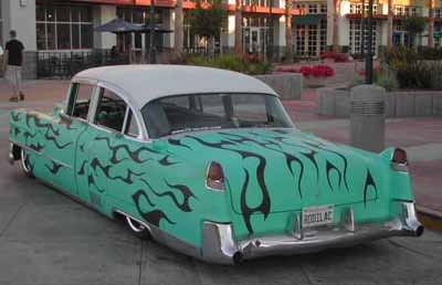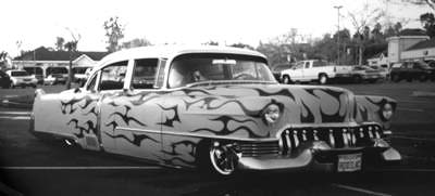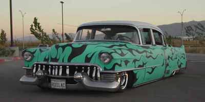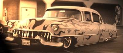 primer green body, white primer top, black primed flames. nosed, decked, shaved antenna and hood ornament as well as emblems and caddy insignias, nose pointed, hoodline removed, taken down to steel fully, all rust repaired.