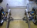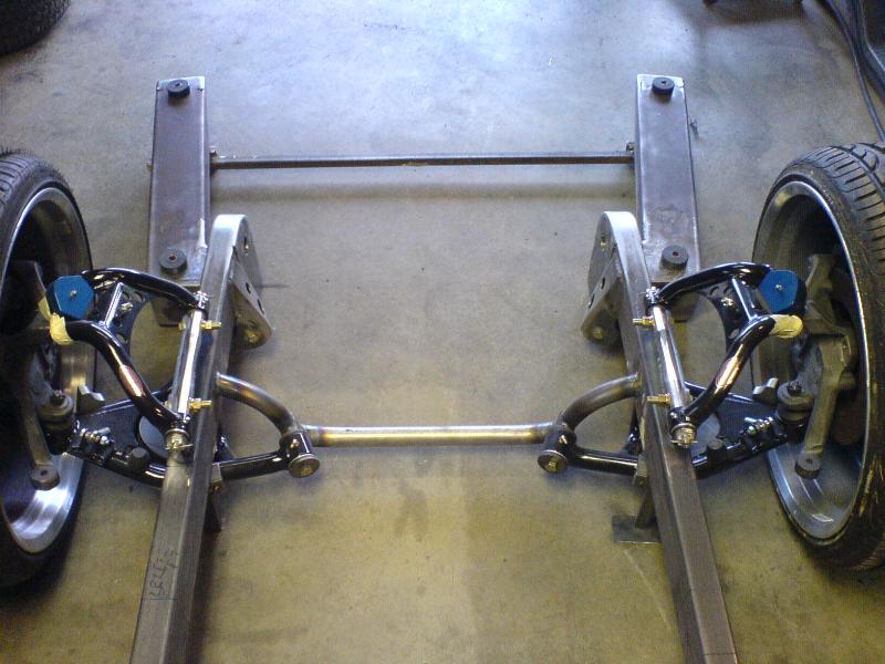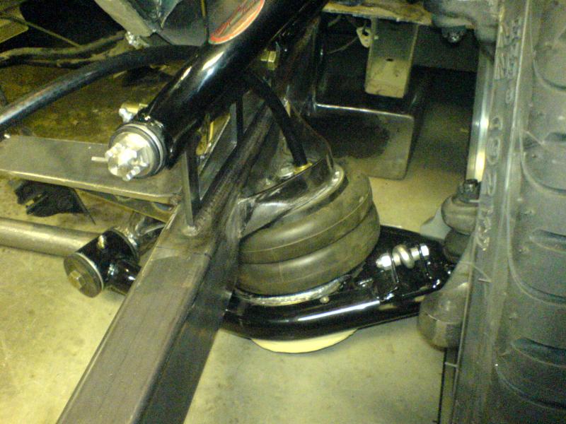 Fabbed front frame, wishbone 4-link out back, slam bags.