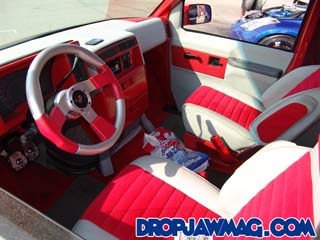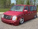 03 ESCALADE FRONT END 89 DEVILLE TAILLIGHTS SHAVED DOOR HANDLES AND GAS DOOR SMOOTH ROLL PAN TWO TONE RED PAINT WITH SILVER FLAME DONE BY MAD PROFESSOR CUSTOMS