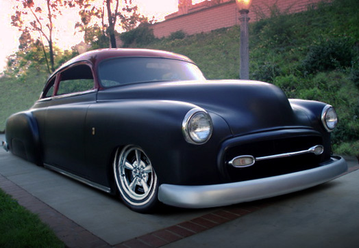 Shaved: door handles, hood, trunk. roof chopped 3 1/4". roof painted with HoK Orion Silver base and topped with Kandy Apple Red. the body was painted with a black basecoat and flexed clear. hand-fabbed grill shell with a '55 Chrysler grill bar. ~SOLD~