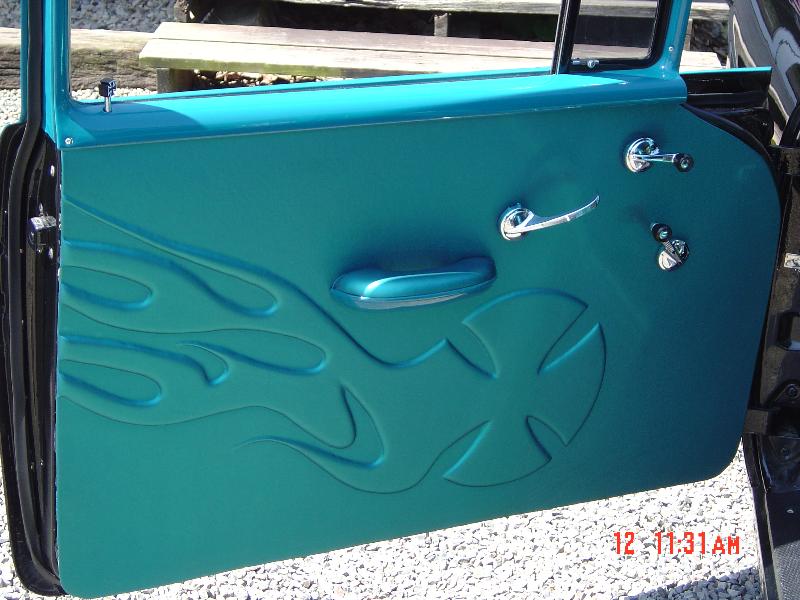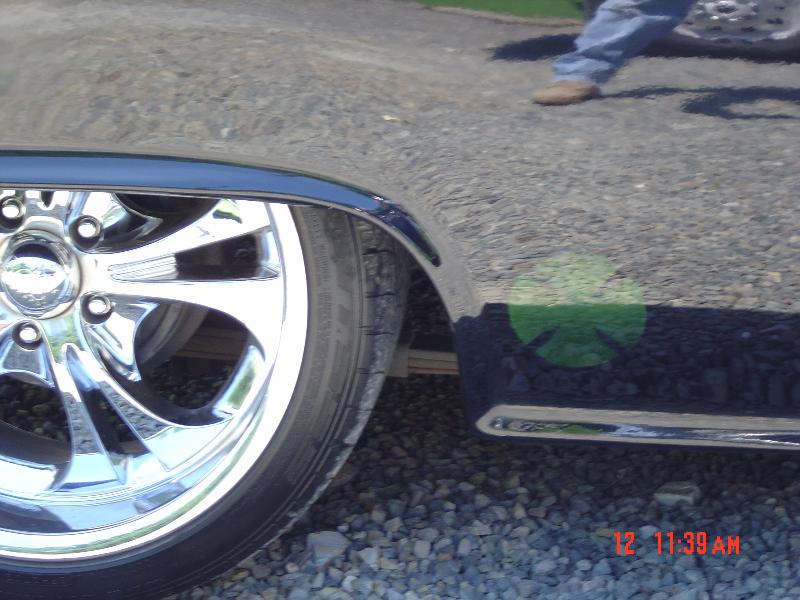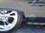 NO CROME , PAINTED BY ANTHONY AND ME AT OUR SHOP REEDS EARLY IRON . IT HAS A BLACK ON BOTTUM WITH A SEA FOAM GREEN ON TOP IT IS A SHERWIN WILLIAMS BASE AND HOUSE OF COLOR CLEAR ON TOP . IT HAS A PURPLE PIN STRIP BETWEEN THE TWO . ON THE TRUNK IT HAS DUPOINTS CRHOMALUSION AND A MIX OF R&M EXTREME FLAMES AND CROSS .
